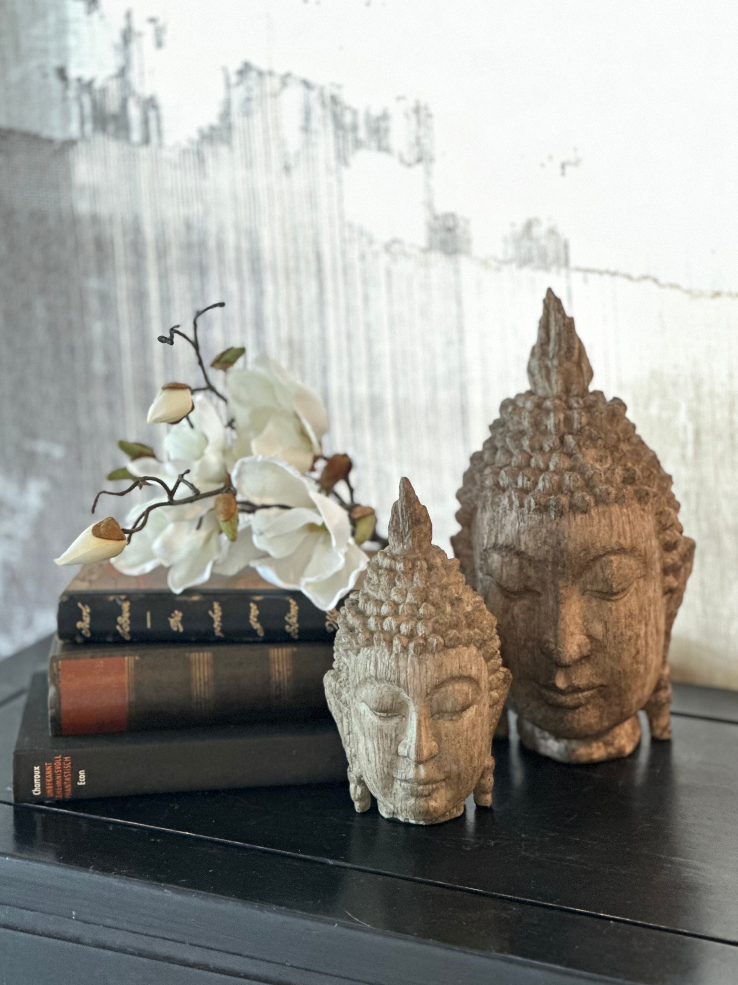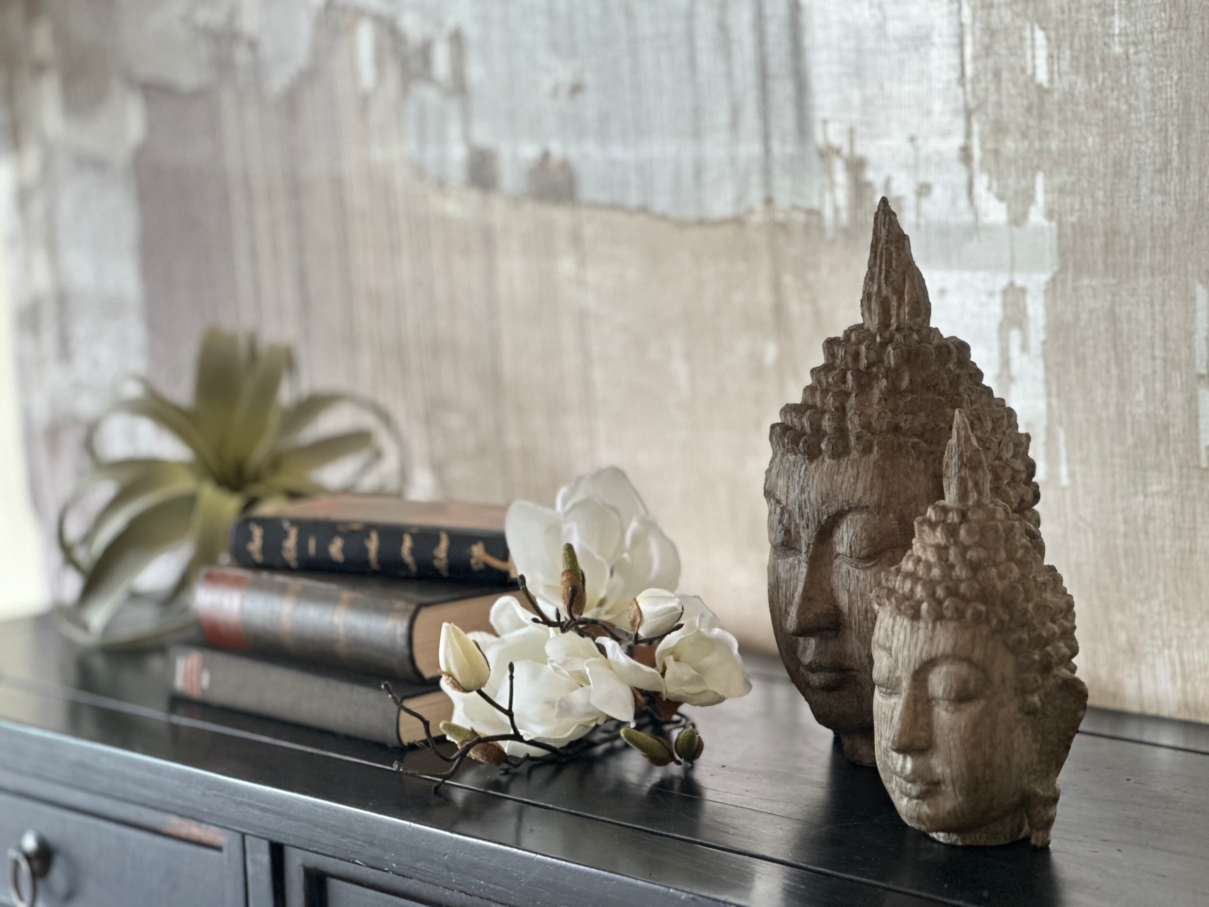 本棚やチェスト、お部屋の空いたスペースにさりげなく飾れるブッダ。
