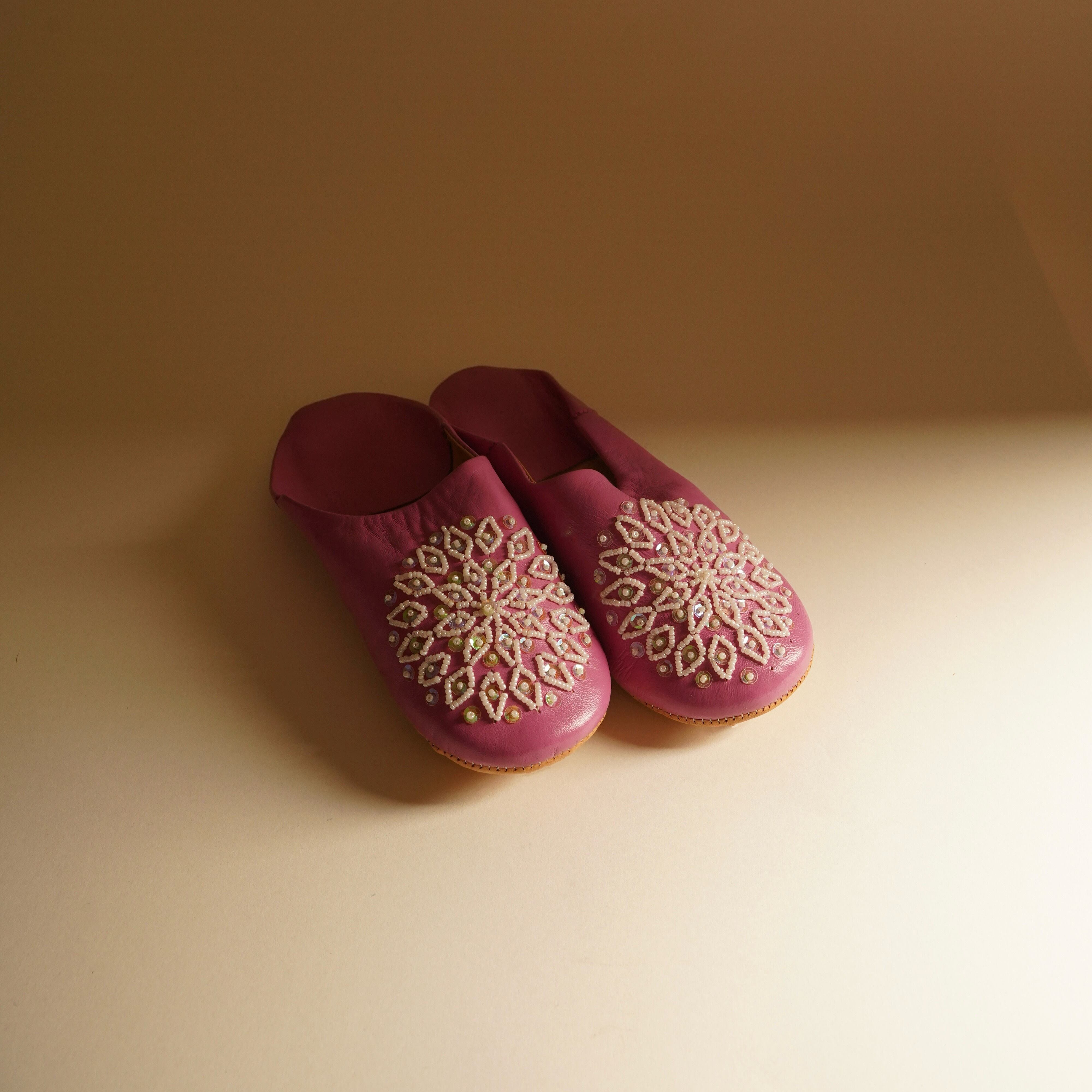 バブーシュは昔からモロッコの人々に愛され、日々履かれている、羊革のスリッパのことです。とても柔らかい羊革でできており、履きこむごとに足の形になじみ、冬は暖かく、夏は涼しく年間を通して履いていただけるスリッパです。